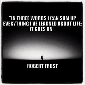 Life, it could be easier at times we believe. We spend so much energy and time figuring out solutions to our daily predicaments. On top of that, we then look deeper into ourselves to find even better ways to handle situations that have come and gone! The stress of our lives we compound by reevaluating past moments of stress. This is all part of our life and maybe we should alter our perspective from addressing the past issues to focusing on the future outcome of our daily lives instead. Perhaps the best solution for a happier future is temporary retreat from an issue, to buy time, allow natural growth. Then again, running head first into the issues for immediate resolve might be ideal. Rush into a situation and command change and progress now, not later! Whatever your decision, and there are far more possibilities than the 2 listed here, Robert Frost (an American poet) clearly states the outcome of all possibilities. Make the happiest tomorrows however you choose because at the end of the day, life, it goes on.